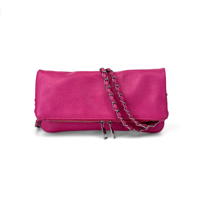 Bolso tipo bandolera. El compartimento principal plegable con cierre mediante cremallera. Cuenta con dos asas en cadena.