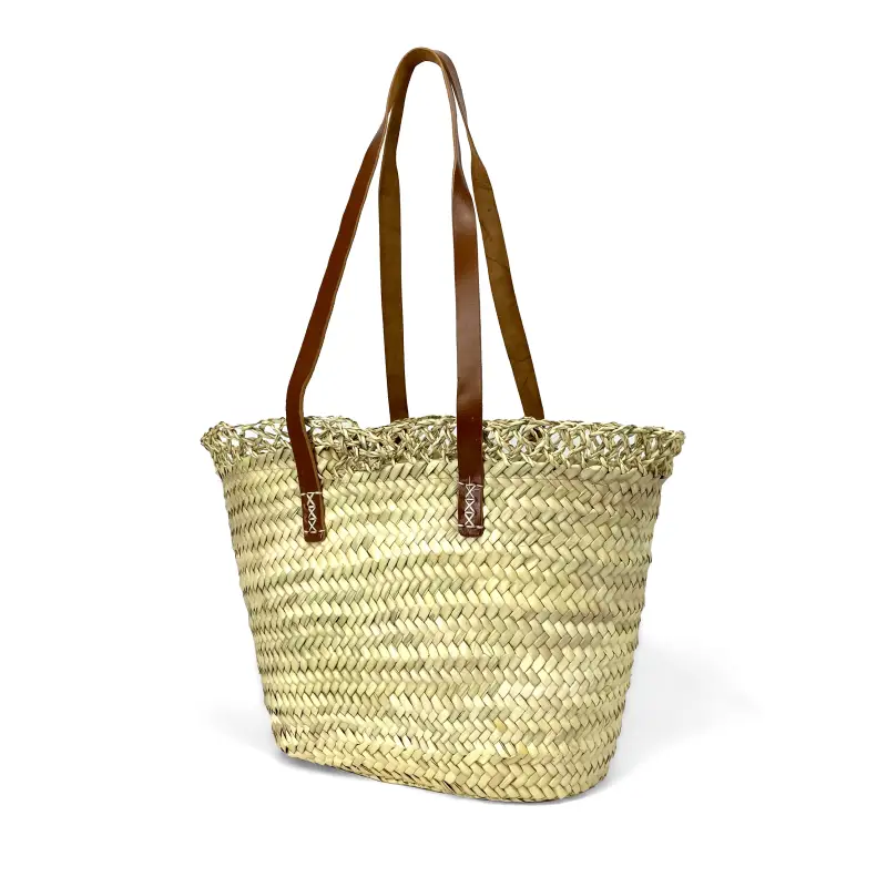 Bolso formato capazo trenzado en hoja de palma. Cuenta con dos asas de mano de cuero.
