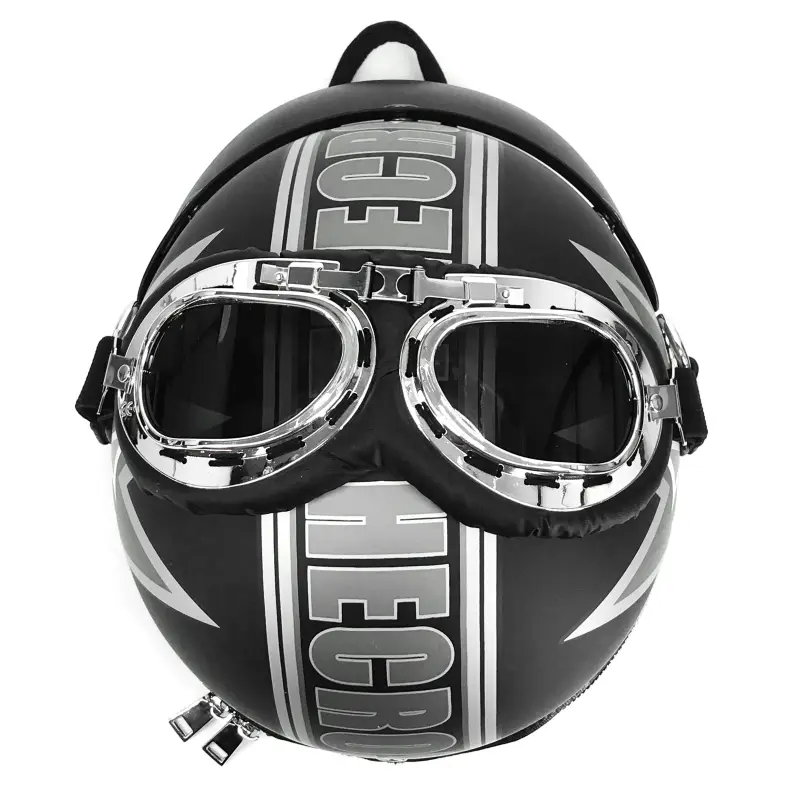 Mochila diferente con forma casco de motocicleta. El compartimento principal con cierre mediante cremallera. En su interior tiene un bolsillo sin cierre y dos bolsillos con cierre mediante cremallera.